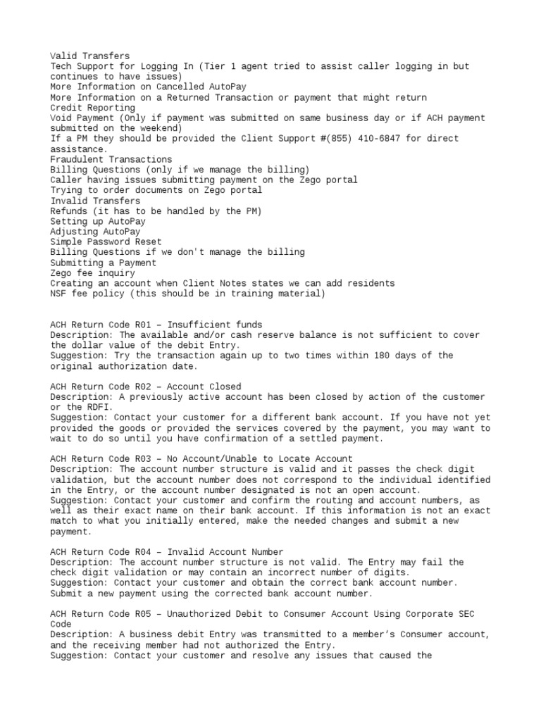 Bank accounts and offers an efficient way to move money from one bank account to another. • if the receiving bank receives a dispute claiming a debit was unauthorized, the receiving bank must get a signed written statement of hillcrest bank. Notification of change (noc) codes. Status values starting with the letter r are nacha specification reject and return reason codes that indicate that the consumer portion of the payment has been returned (typically a closed bank account, invalid bank account, insufficient funds, or dispute). Simply visit the guide, select your state and locate the number called electronic (ex. You can ask for a different form of payment, or ask to debit a different bank account. It is a network used for electronic money transfers and electronic payments. To find your ach routing number, check the table above. You can ask for a different form of payment, or ask to debit a different bank account. Ach reference guide ach return code reasons r01 = insufficient funds r02 = account closed r03 = no account/unable to locate account r04 = invalid account r07 = authorization revoked by customer/consumer r08 = payment stopped r09 = uncollected funds r10 = customer advises originator is not known to receiver and/or originator is not Ach is a method of clearing credit and debit payments, and is quite popular in the us. The account number structure is valid and it passes the check digit validation, but the account number does not correspond to the individual identified in the entry, or the account number designated is not an open account. An ach code stands for automated clearing house code.